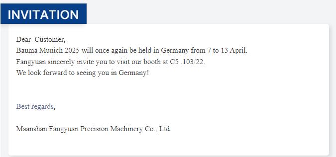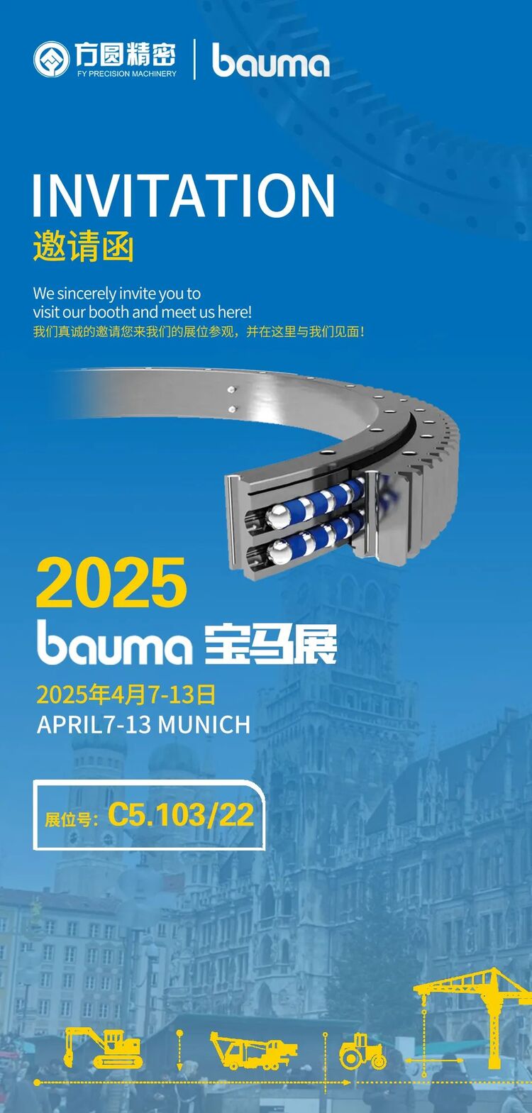 2025年4月7-13日,工程機械領域的國際頂級盛會,第34屆德國慕尼黑BAUMA展,將在慕尼黑新國際博覽中心震撼啟幕。德國慕尼黑工程機械展-寶馬展(BAUMA)是全球規模最大、最具影響力的國際工程機械、建材機械、礦山機械行業專業展覽會。是了解和評價工程機械行業發展相關技術進步的重要標尺,為規劃開拓國際市場的工礦機械企業搭建了良好的平臺。 方圓精密誠摯邀請您蒞臨我們的展位,期待與您面對面交流,探討合作機會。您的光臨將是我們莫大的榮幸!